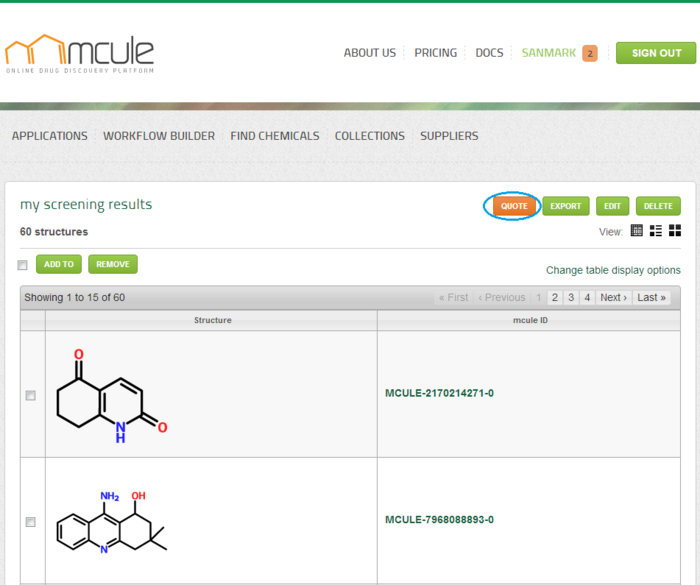 All entries in a collection can be purchased if they are derived from the “Purchasable compounds collection”. To request a quote, please click on the orange “Quote” button when the actual collection is displayed. Learn more about compound delivery at mcule.com.