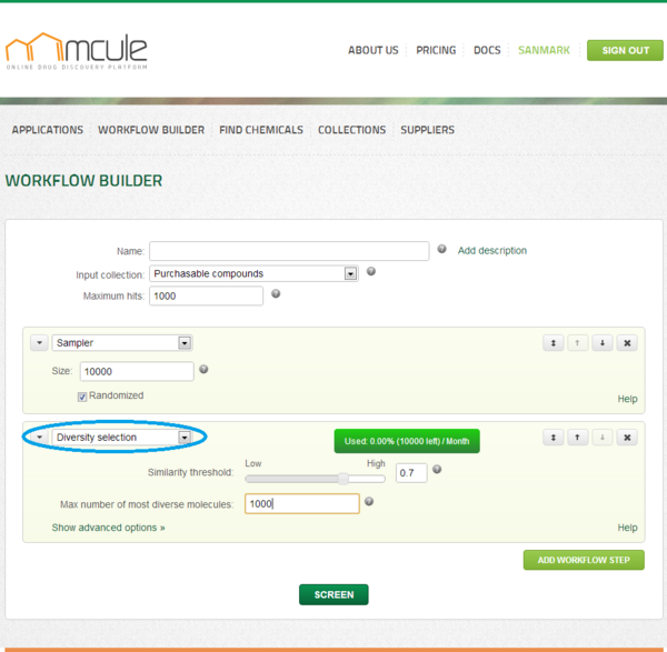 Diversity selection available in the Free package is limited to 10,000 input molecules per month. To get access to unlimited Diversity selection, subscribe to our Library Design package.