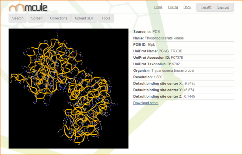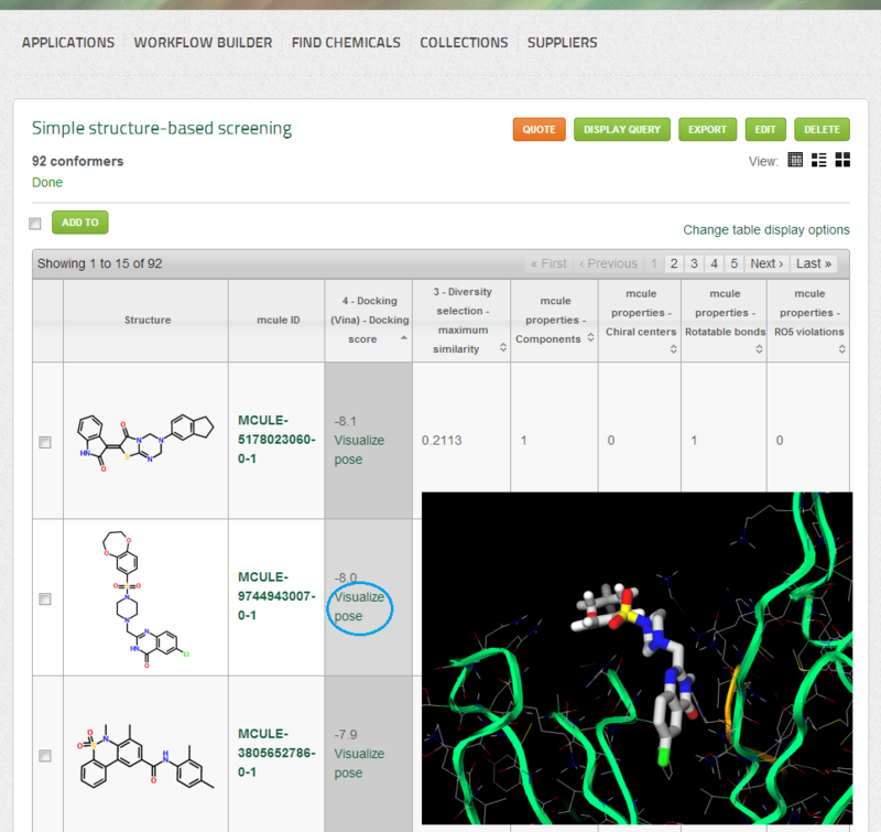 Docking (Vina) workflow step requires input ligands with a valid 3D structure, therefore the input ligand collection is prepared for docking as follows. Unknown or undefined tetrahedral stereocenters and cis-trans double bonds are converted into well-defined centers and double bonds by the stereoisomer generator of mcule. Molecules failed to dock are skipped. To ensure that molecule conversions did not affect the identity of the molecule, InChI strings of the docking input and output are compared and in case of InChI mismatch, the molecule is skipped.