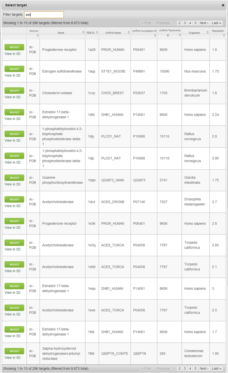 When browsing the already available targets, you can search/filter/rank the entries by PDB ID, Protein name, Organism name, UniProt Name/Accession ID/Taxonomic ID. Your previously uploaded targets will also appear here, but they can be deleted at any time (Click on “Delete” in the first column). Selection can be made by clicking on “Select” in the first column. To visualize the target, you can click on “View in 3D” under “Select”, which will open a new page with an interactive 3D visualization box containing the target.