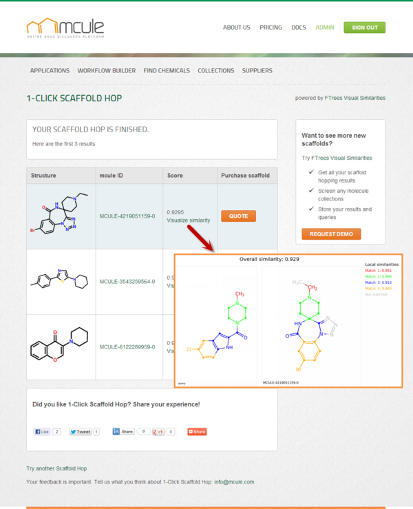 Draw a known active ligand and jump to a new active scaffold by clicking on Scaffold Hop! To understand why the two molecules are similar click on “Visualize similarity” when browsing the results. To purchase any of the hits click on the orange “Quote” buttons. Click here for a tutorial video.