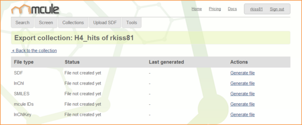 Collections can be exported in SDF, InChI, SMILES, InChIKey and mcule ID formats, by clicking on the “Export” button when the actual collection is displayed. While SDF preserves 2D or 3D coordinates, InChI and SMILES formats will lose this information. SMILES strings will preserve stereochemical parities only.