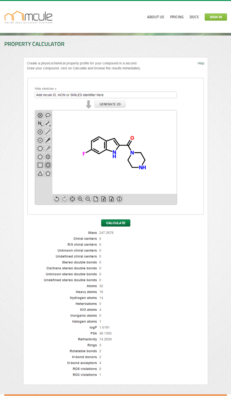 After defining your query either drawing it into the sketcher, or typing an InChI or SMILES strings or an mcule ID into the input field, click on the “Calculate” button and the mcule properties will be displayed under the sketcher.