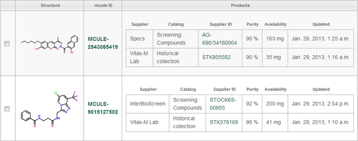 Compound suppliers have their own compound database and online interface. At mcule.com not only are the structures collected and standardized but product data is also synchronized. When it is possible, we access and collect the in-stock available amount of the products and display it to you.
