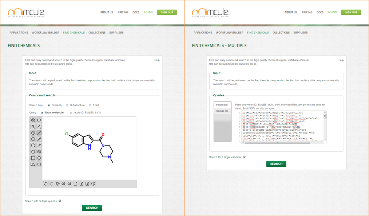 was primarily designed for fast searching of the Purchasable compounds collection of the mcule database. You can use it to run similarity, substructure and exact searches with a single or multiple queries. The query molecules can be specified by ChemWriter (instant appearance, comprehensive set of functionalities) or by entering mcule IDs, SMILES strings or InChIs. Start browsing the results immediately and buy the best hit(s) by just a few clicks.