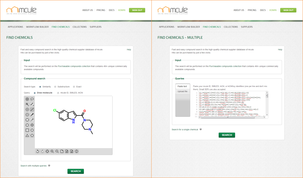 Extremely fast and easy-to-use web interface that helps to find purchasable chemicals in the high quality database of mcule.