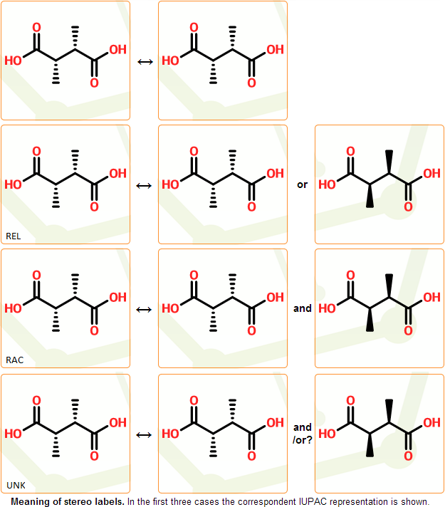 Interpretation of the absolute, relative and racemic types is shown in table. The unknown configuration type indicates that configuration type cannot be the determined surely. One should treat structures with unknown configurations as if they have absolute configuration not confirmed by the compound supplier.