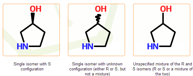 Geometry around a tetrahedral center is specified using wedge bonds pointing to the center with their narrow ends. Up (solid) and down (hashed) wedge bonds denote well-defined geometry. Wavy bond is used to denote centers with unknown geometry: in this case the configuration is either R or S, but definitely one of them. Unmarked centers (without wedge or wavy bonds) denote fully unspecified geometry, the configuration can be R or S or a mixture of the two.
