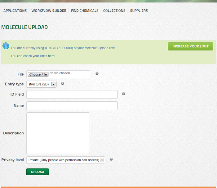 Currently, the maximum number of uploaded molecules in the Free package is 500. If you would like to change this limit, click on the “Increase your limit” button.