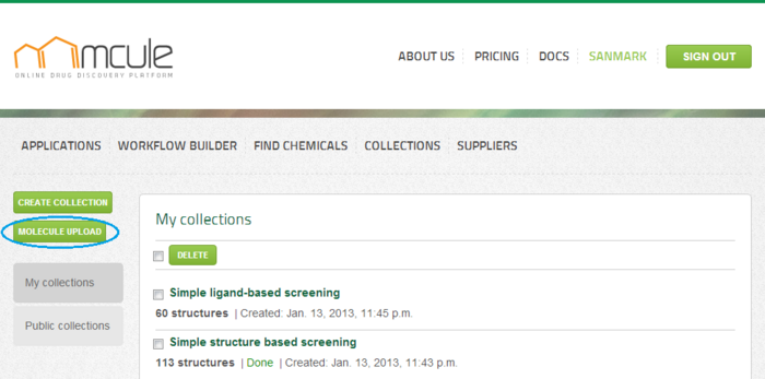Users can create collections of user molecules by clicking on the “Molecule upload” button under the “Collections” tab. This feature opens the door to most search and screen functionalities on user uploaded molecules. Note that some advanced tools offered in subscription packages cannot be used on user uploaded molecules. You can basically upload any virtual molecule library or your in-house molecule database. Please note that user uploaded molecules are currently not processed by the mcule structure registration system. Consequently, uploaded molecules will not be associated with MCULE IDs. They will be handled separately and will get “S” (structure, e.g. S-16992987) or “C” (conformer, e.g. C-71293984) IDs.