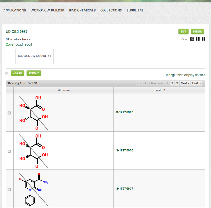 After uploading the molecules the user collection is created. Please note that it might take significant time to generate properties and fingerprints for each uploaded molecule, but this is necessary for enabling the searching/screening functionalities. After the uploading and preparation processes have been finished the user collection will become available under the “Collections” tab as well as it can be selected as an Input collection of any searches and screens. When clicking on the “Load report” link, a short report about the percentage of successfully uploaded molecules will be displayed. Uploaded structures and conformers will be displayed as “u. structures” and “u. conformers” respectively.