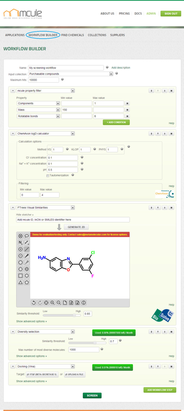 Under the “workflow builder” tab, linear virtual screening workflows can be built. These workflows comprise of a chain of workflow steps. The workflow steps can be filters (e.g. mcule property filter) that reduce or generators that increase the number of entries in a collection. To check the list of the currently available workflow steps, click here.