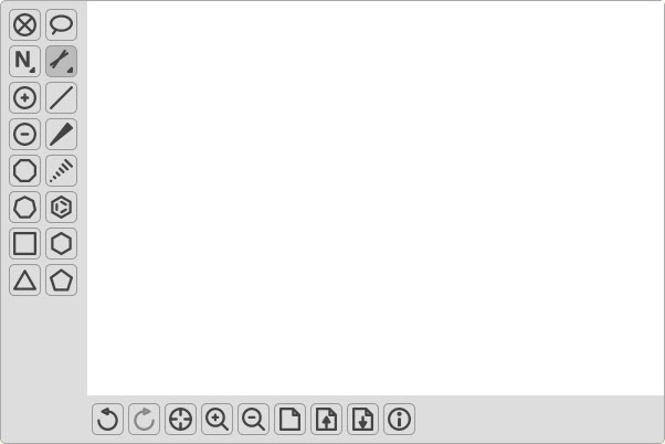 It can be used to draw query molecules e.g. for similarity searches. Atom types can be selected from the menu bar on the left-hand side (second line, left). Atom symbol of already drawn atoms can be changed by moving the mouse above them and type in the symbol of the required atom. Isotopes and radicals are currently not supported. Structures (in Mol format) can be exported or imported by clicking on the 7th or 8th buttons in the bottom menu bar. Extra stereo bond types, such as the crossed double bond (unknown/undefined cis-trans double bond) and wavy single bond (unknown single bond) are available from the menu bar (second line, right). Note that the direction of the up and down wedge bonds and wavy bonds can be changed by clicking on the drawn bond again.