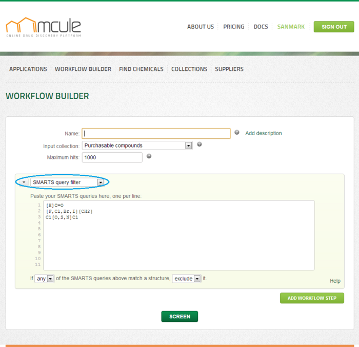 SMARTS filter available in the Free package has the following limitations: - max 5 queries per filter - max 1 filter per workflow To get access to unlimited SMARTS query filter, subscribe to our Library Design package.